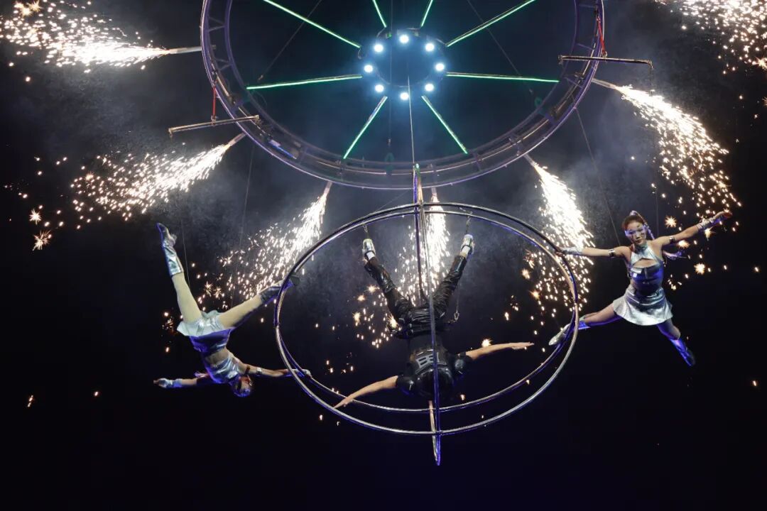 高空威亚秀《赛博未来GO高新》惊艳亮相,演员们身着特色服装,在空中舒展身姿,时而轻盈盘旋,时而快速穿梭,搭配着科技感十足的背景画面,将安康高新区的未来活力与创新精神展现得淋漓尽致,引得观众纷纷拿出手机记录这震撼瞬间。