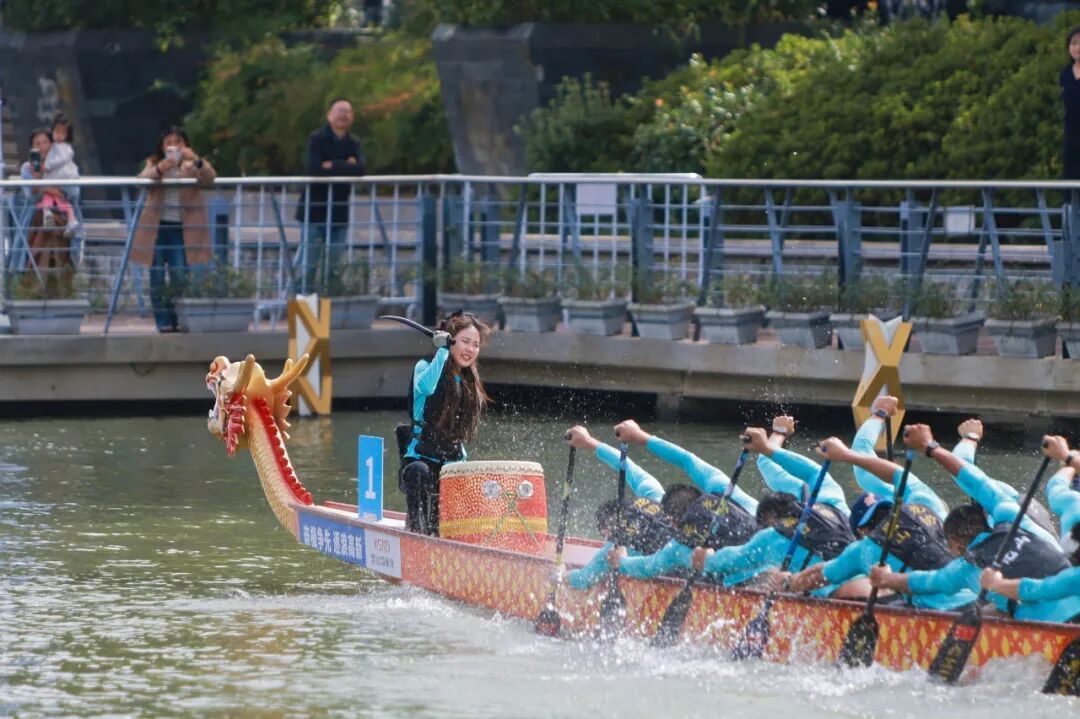 选手们伴随着有力的鼓点,挥桨破浪、齐力奋进。每一次划桨都凝聚着团队的力量,每一声呐喊都迸发着拼搏的精神。300米的赛道上,各代表队你追我赶,上演了一场速度与激情的精彩对决。