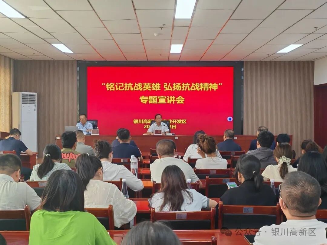 9月2日,银川高新区邀请宁夏回族自治区党委老干部局“塞上金秋”宣讲团骨干成员王军同志开展“铭记抗战英雄 弘扬抗战精神”专题宣讲,银川高新区机关和企业党员干部职工60余人参加。