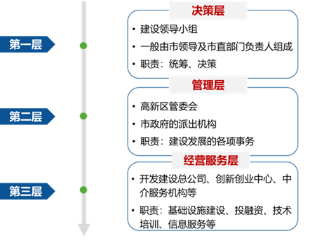 1988年,国务院批准实施火炬计划,明确把创办高新区作为火炬计划的重要内容;同年,批准建立第一个国家高新区——北京市新技术产业开发试验区(以下简称“北京试验区”),也就是中关村科技园区的前身,批准颁布《北京市新技术产业开发试验区暂行条例》,拉开了我国建设国家高新区的序幕。北京市政府根据该《暂行条例》发布实施细则,明确规定北京市试验区办公室是海淀区人民政府的派出机构 ,在海淀区人民政府领导和市科委指导监督下,具体办理新技术企业的审批核定事宜。同年7月,为加强对北京试验区的领导和协调工作,北京市政府牵头组建了北京试验区协调委员会 ,由北京市副市长任委员会主任,北京试验区办公室兼协调委员会办公室职能。北京试验区的建设模式为后来国家高新区组建领导小组,成立作为政府派出机构的管委会奠定了重要基础。在中关村科技园区成功探索的基础上,1991年和1992年,国务院先后批准建立了51家国家高新区,全面启动国家高新区建设。为贯彻落实党中央、国务院的指示精神,1991年,原国家科委和国家体改委研究制定了《关于深化高新技术产业开发区改革,推进高新技术产业发展的决定》,进一步明确了国家高新区改革的基本方向、原则和思路,明确国家高新区要根据发展社会主义有计划商品经济的要求,建立起符合商品经济运行规律,适应高新技术产业发展要求和国际惯例的体制、机制;各开发区要因地制宜地建立决策、管理机构,赋予相应的权限,代表当地政府行使行政职权, 统一对内对外,集中有效地协调解决开发区发展中的重大问题,并在工商、税务、财政、金融、国际合作交流、外贸、进出口等方面形成配套、高效的服务功能,为企业提供综合服务。在1988年到2000年的“一次创业”阶段,国家高新区发展到53家,成为我国高新技术的集聚地和成果转化、产业发展的增长极。由于这一阶段高新技术产业发展基础总体薄弱,需要强有力的管理机构创造发展环境,同时借鉴了当时国家经开区的管理经验,大多高新区采取较封闭的管理模式,探索集中授权管理。 初步形成了具有中国特色的“领导小组+管委会+公司” 管理架构,实行“决策层-管理层-服务层” 开放式管理模式。其中,“决策层”即由市政府主要负责人及市政府有关行政管理部门负责人组成的领导小组,为强化政府的作用,一般由市级主要领导担任领导小组组长。主要负责宏观决策、重大政策制定、用地规划、协调解决高新区开发建设及管理过程中的重大问题等。“管理层”即作为政府派出机构的管委会,代表当地政府行使政府职权,对园区实行统一领导,负责具体发展规划、建设和管理等职责。“服务层”即设立园区开发建设公司、创新创业中心等,负责园区基础设施建设、投融资、创业孵化等功能。实践中,各国家高新区也结合自身实际情况,逐步探索适宜区域特征、顺应市场经济发展的多样化管理体制 。如南京高新区创建初期采取以管委会为主导的政企并存模式;海南高新区、深圳高新区采取以企业、总公司为主导的管理体制;桂林高新区由具有一定行政职能的事业单位来实行企业管理;中山、厦门和威海三个国家高新区,由原国家科委、省科委和当地政府合办,被命名为火炬高新区,在行政管理的基础上,成立开发总公司,负责高新区基础设施建设、新技术产业投资和部分公共事务管理。