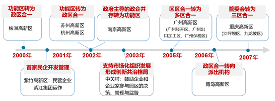 二、“二次创业”阶段:深化“精简、高效”改革,积极探索经济与社会统筹管理机制 进入21世纪,国内外经济形势发生巨大变化,中国加入WTO,科技创新成为我国发展主旋律。2001年,科技部在总结前一阶段国家高新区建设经验的基础上,研究提出了国家高新区“二次创业”的新任务和新目标,核心是要推进“五个转变”, 从第一阶段的外延式发展向更加依靠科技创新的内涵式发展阶段转变,更加注重“创新驱动、内生增长” 。2002年,科技部印发《关于国家高新区管理体制改革与创新的若干意见》,指出国家高新区要建立适应社会主义市场经济要求和高新技术产业发展规律、符合WTO规则的管理体制和运行机制,国家高新区管理机构要按照“精简、高效、优质”的原则不断推进职能转变 ,进一步提高管理效率和灵活度。“二次创业”期间,国家高新区普遍加强了内涵式和外延式相结合、引进大企业和培育小企业相结合的发展力度,不仅大力引进国内外研发机构、科教资源和龙头企业进驻,而且着力营造创新创业氛围,建设不同类型的科技企业孵化器,运用各种政策手段和市场力量,推动内生发展动力的增长,形成了研发机构密集、大企业和小企业和谐共生的产业链条。同时,国家高新区也不再是单纯的产业园区,而是形成了产城融合的具有现代化形象的科技新城和城市新地标, 不仅增强了创新活力和发展实力,而且提高了示范、辐射、引领和带动作用,成为宜居宜业的创新创业高地,相应也带来诸多社会事务管理方面的新挑战 。经过十余年的发展,特别是产业规模的迅速扩大,部分国家高新区面临空间紧缺的瓶颈,于是采用了不同方式,扩大管理范围,拓展发展空间 。同时,现实中的不完全政府模式、不明晰职能边界导致的矛盾日益凸显,管理体制机制不顺成为制约国家高新区创新发展重要因素。为此,国家高新区先后开启了不同类型、不同程度的新一轮管理体制改革 。如株洲、青岛、桂林、苏州等高新区为解决空间不足、社会事务难以协调等问题,将高新区与行政区合并或建立新区;上海紫竹采用多元化的股权结构,形成民营企业、高等院校、市区镇政府“三结合”运营模式,成为全国首家以民营企业为开发主体的开发区;广州高新区进一步与新组建的萝岗区合并,重庆高新区与沙坪坝区、九龙坡区等的乡镇街道合并实现扩容升级,等等;形成包括区区合一、政区合一和多区合一模式。