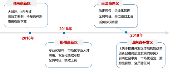 三、“创新驱动战略提升”阶段: 加快转变政府职能,着力推进市场化改革 党的十八大以来,改革进入了深水区,开放迈向了新阶段,创新驱动发展成为国家战略,国家高新区进入“创新驱动、战略提升”阶段 。党中央、国务院高度重视转变政府职能,把“放管服”改革作为全面深化改革的重要内容,持续推进简政放权,实行放管结合,优化行政服务,以市场在资源配置中起决定性作用和更好发挥政府作用为目标,着力破解制约科技创新活力的体制机制障碍。2013年,科技部出台《国家高新区战略提升行动方案》,提出国家高新区要积极建设服务型政府,形成国家、地方、社会等各方力量联合治理新模式。2017年2月,国务院办公厅出台《关于促进开发区改革和创新发展的若干意见》(国办发[2017]7号),提出开发区要将政企分开、政资分开,行政剥离、市场化运作作为下一步改革的重点方向。2020年7月,国务院出台《关于促进国家高新技术产业开发区高质量发展的若干意见》(国发〔2020〕7号),对国家高新区深化管理体制机制改革作出顶层设计 ,要求国家高新优化内部管理架构,实行扁平化管理,探索岗位管理制度,实行聘用制,建立完善符合实际的分配激励和考核机制,并赋予国家高新区相应的省级和市级经济管理权限。综合来看,我国正处于转变发展方式、优化经济结构、转换增长动力的攻关期,国家高新区过去依赖政策红利、政府主导色彩浓厚等长期积累的问题逐渐显露,面临着要素成本制约、政策优势减弱、区域内外竞争压力增大、发展活力不足、发展动能减弱等困境,因此积极转变政府职能、引入市场化效率机制势在必行。围绕“放管服”深化改革,一批国家高新区开始积极探索符合新时代要求的行政审批、组织机构、人事管理、薪酬激励新机制,着力构建精简高效的管理服务体系 。如2016年济南高新区坚持问题导向,围绕“企业化管理、市场化运作、专业化服务”目标,推行机构大部制、实行全员聘任制、改革干部考评体系、采用绩效工资制、深化简政放权,激发高新区发展创造力。2019年天津滨海高新区依据自身为功能区的本质,推行法定机构改革,目标是去除行政事业身份,全面引入市场化经营理念和企业化激励机制。2020年,玉溪高新区、兰州高新区等围绕强化经济发展和创新促进功能,探索开展全员聘任制、绩效考核制、薪酬激励制等改革,以进一步激发广大干部的干事创业热情。