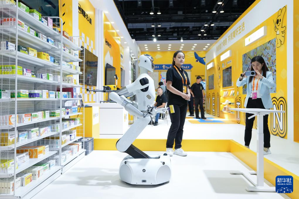 9月13日,在服贸会国家会议中心综合展区,参观者在拍摄美团买药无人值守场景机器人演示。