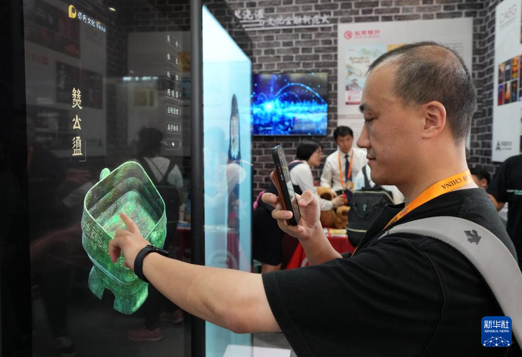 9月13日,在服贸会首钢园区,一名参观者触摸展出的多功能文保全息展柜的屏幕,查看数字文物的详细信息。