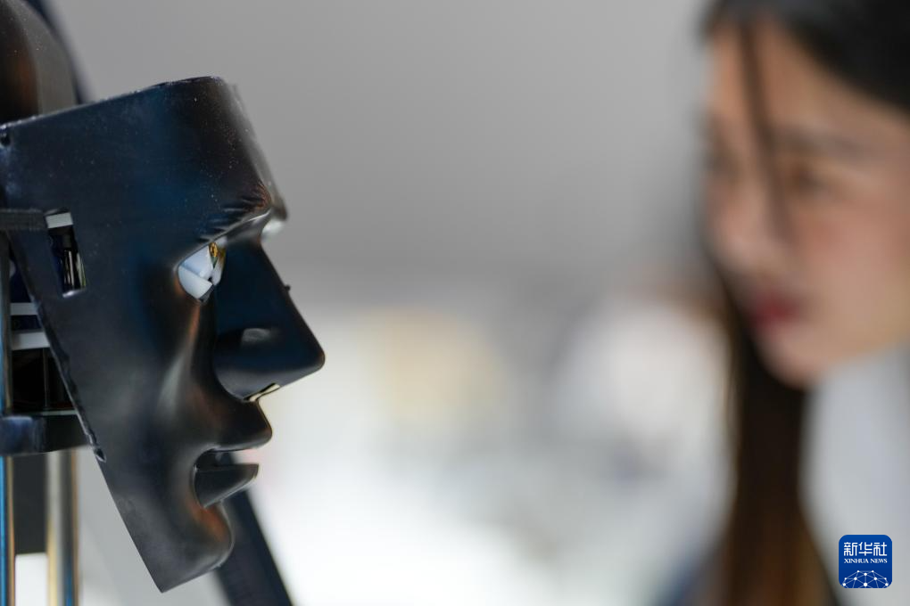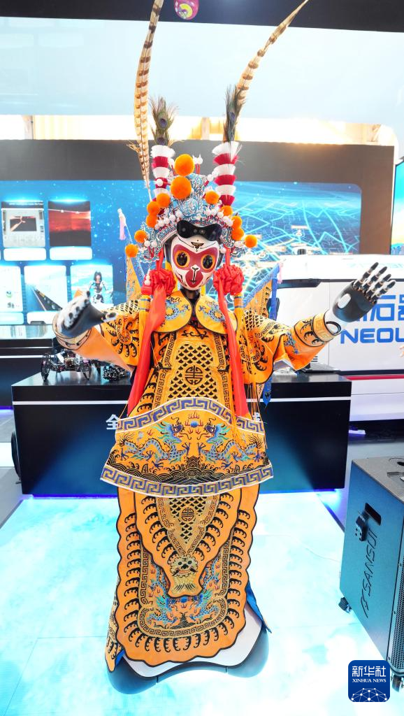 9月13日在服贸会首钢园区拍摄的一款戏曲人形仿生机器人。该戏曲人形仿生机器人可实现智能抓取、自主行走、自动避障、自动平衡等功能,模拟戏曲演员的动作和唱腔,进行戏曲表演,为观众带来全新的观赏体验。