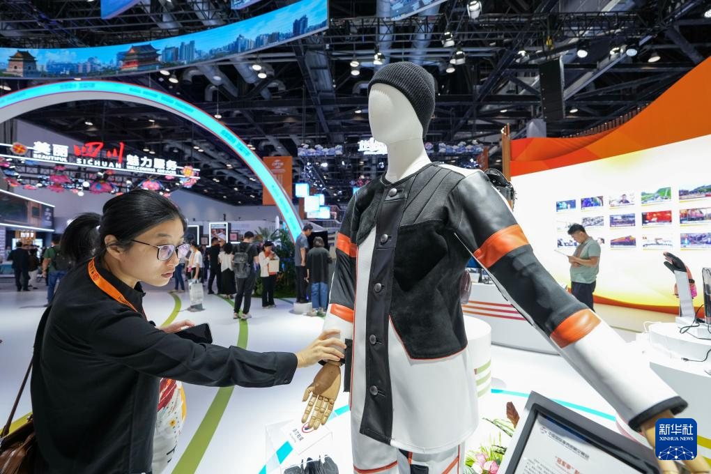9月13日,在服贸会国家会议中心综合展区,参观者观看展出的“冠军甲”射击皮服。
