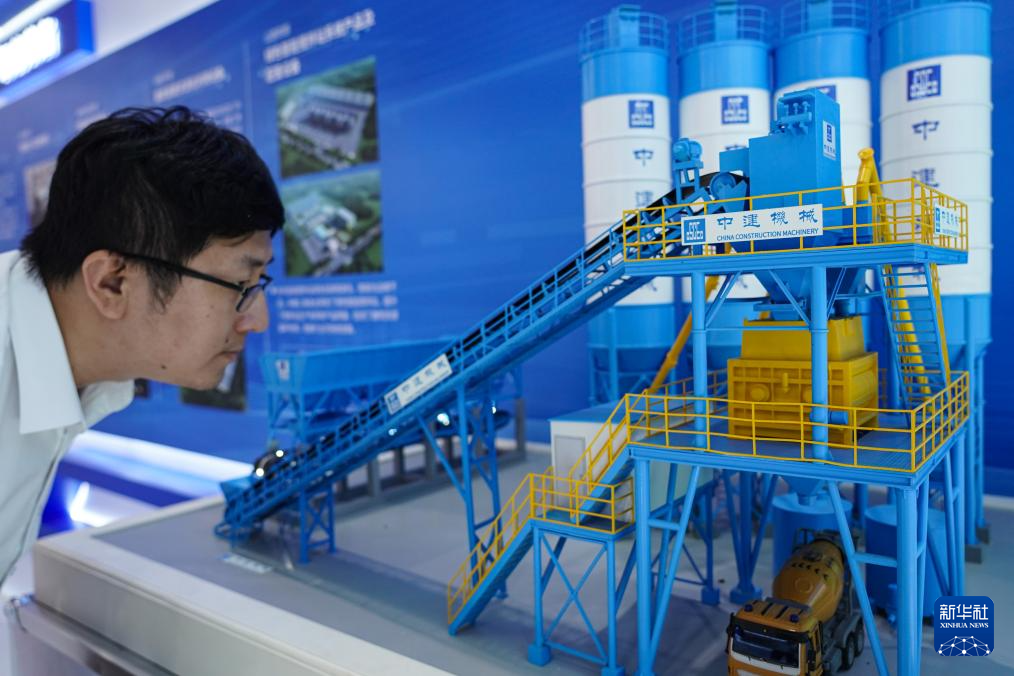 9月13日,在位于首钢园区工程咨询与建筑服务专题展区的中国建筑第二工程局展位上,参展人员观看绿色智能搅拌站系统模型。该搅拌站系统采用了绿色低碳骨料储运技术、远程集群控制技术、智能化信息化控制技术等,提升搅拌站的生产效率和产品质量,并促进建筑资源循环使用。