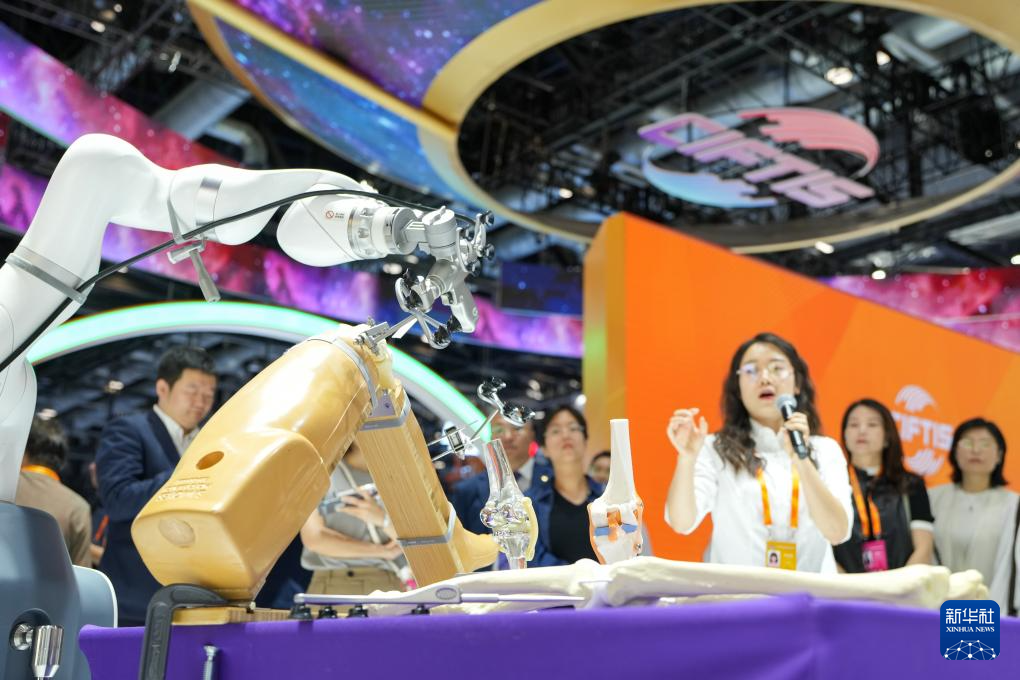 9月13日,参观者在服贸会国家会议中心综合展区参观展出的人工智能骨科手术机器人。