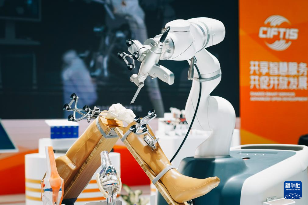9月13日在服贸会国家会议中心展区拍摄的一款人工智能骨科手术机器人。该机器人由“智慧脑+智慧手+智慧眼”组合而成,能够辅助医生将术前人工智能定制的方案在术中精准实施。