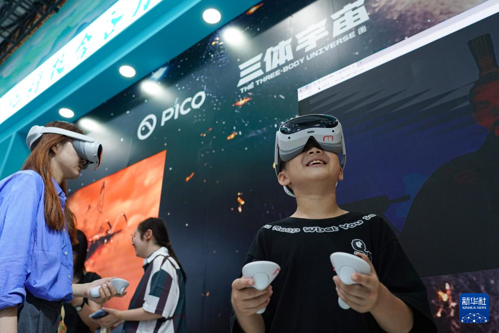9月12日,在服贸会首钢园区文旅服务专区,参观者使用PICO最新发布的PICO 4 Ultra设备沉浸式体验“三体游戏”。