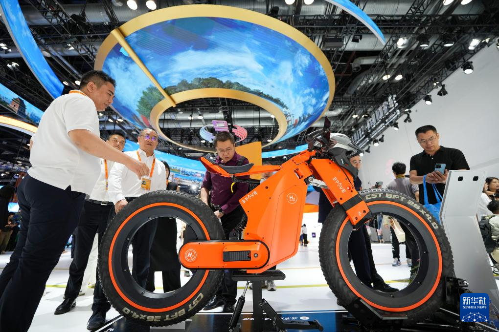 9月13日,参观者在服贸会国家会议中心综合展区参观展出的无辐式超级氢能摩托车。