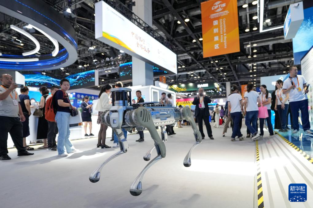 9月13日,在服贸会国家会议中心综合展区,参观者在观看一台机器狗的跳跃演示。