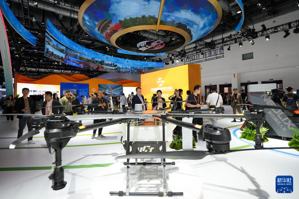 9月13日,在服贸会国家会议中心综合展区,观众参观展出的H200植保无人机。