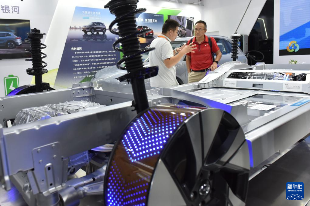 9月13日,在服贸会首钢园区,工作人员(左)向参观者介绍一款新能源汽车的底盘技术。