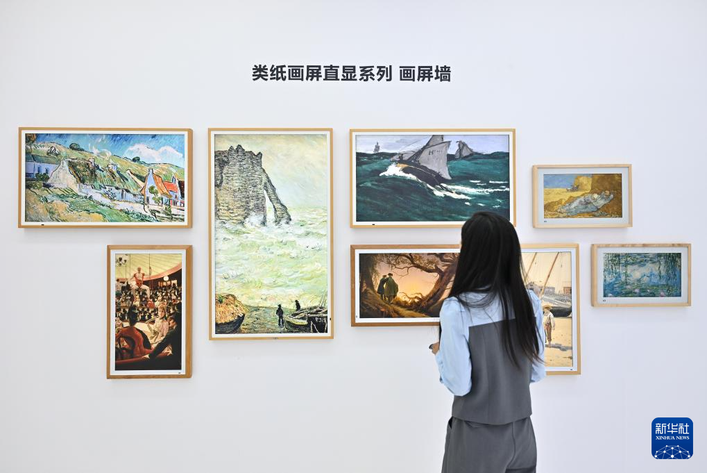9月13日,一名参观者在京东方展台观看类纸画屏直显系列画屏墙,该屏幕运用无损Gamma专利显示技术、低反防炫光技术、自适应感光技术等多种技术实现类纸显示效果。