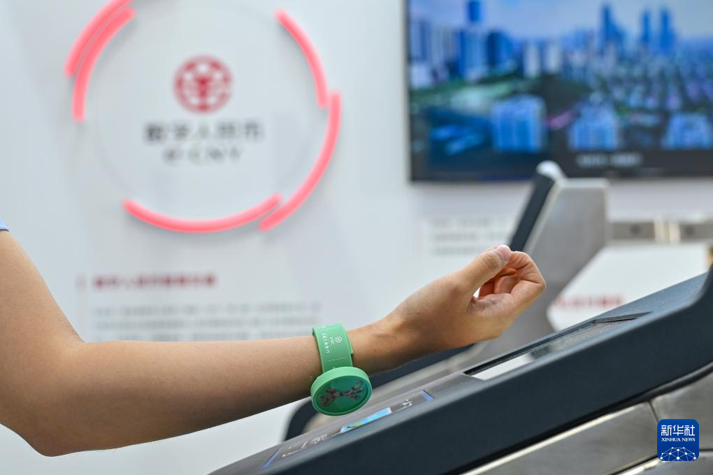 9月13日,服贸会首钢园工商银行展台工作人员展示用数字人民币硬钱包过地铁闸机。