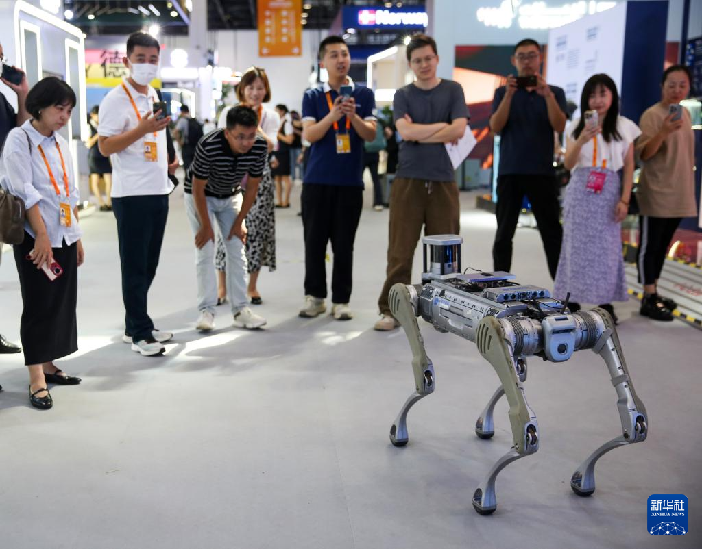 9月13日,在服贸会国家会议中心综合展区,参观者在观看一台机器狗的跳跃演示。