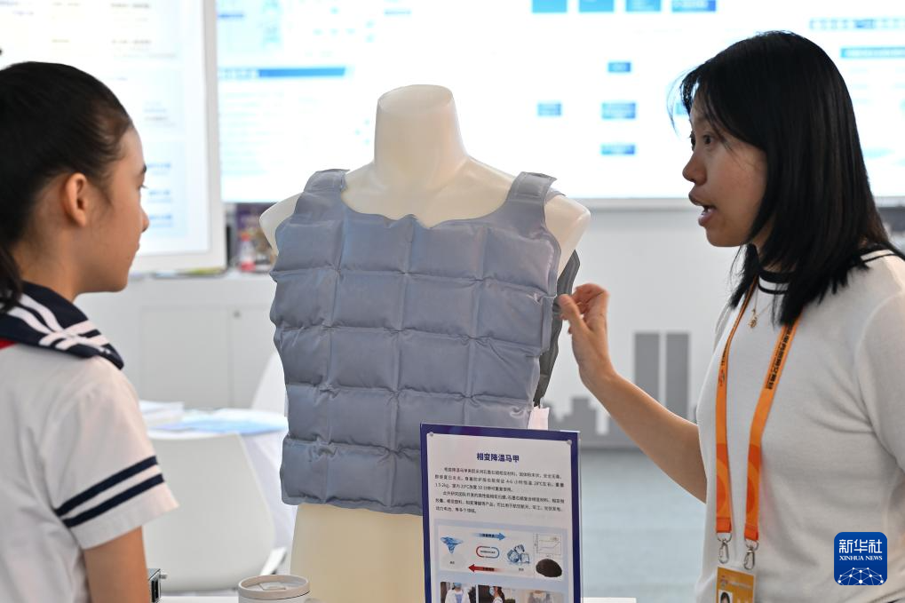 9月13日,一名参观者在服贸会首钢园区了解一款由中科院研发的相变降温马甲。该马甲具有恒温、可重复使用等特点。