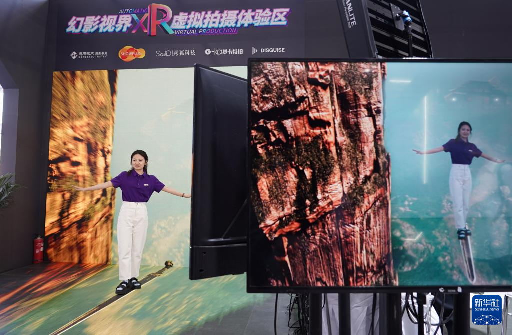 9月13日,在首钢园区文旅服务专题展区的中国电影博物馆展位,参展人员在体验XR(扩展现实)虚拟拍摄技术。