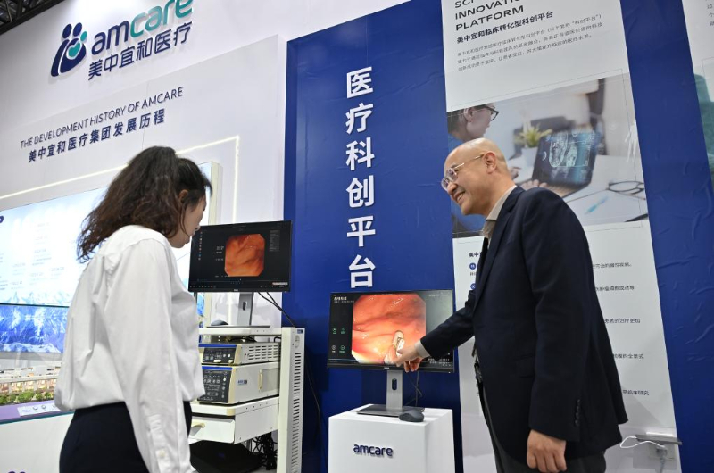 9月13日,参观者在服贸会首钢园区了解一款AI胃肠镜医疗平台。新华社记者李鑫 摄