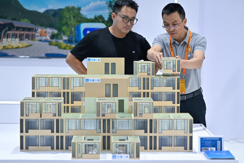 9月13日,参观者在服贸会首钢园区中建一局展台观看预制混凝土结构箱式房屋建筑模型,该建造技术具有模块化设计、工厂化加工、一体化装修等优势,大大缩短施工周期。新华社记者 李鑫 摄
