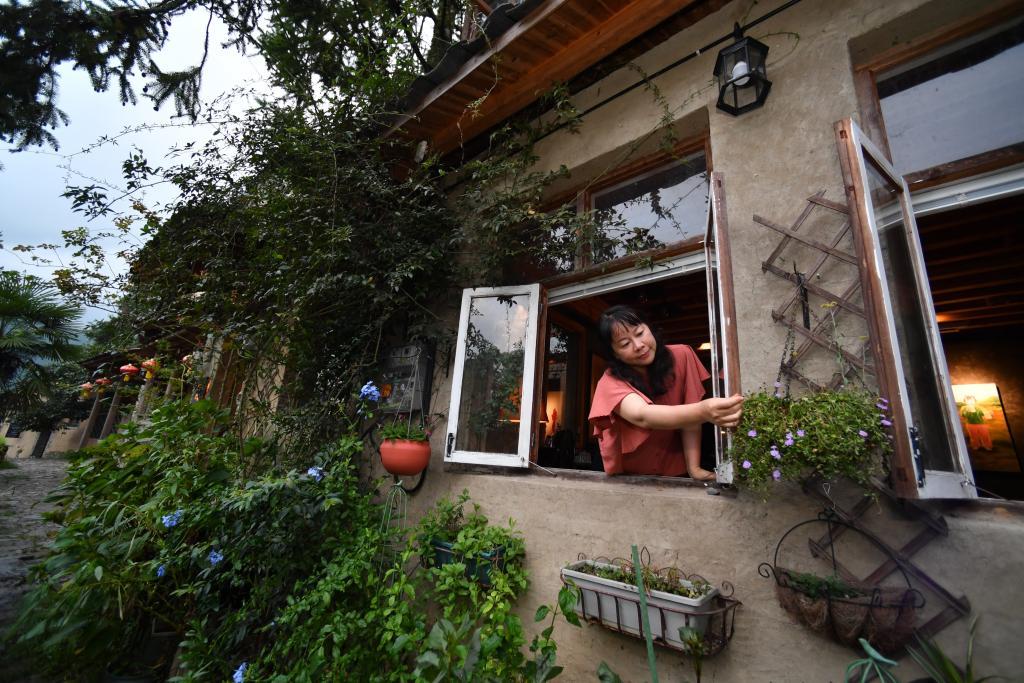 8月29日,在福建省屏南县熙岭乡,龙潭村“新村民”梅宏在打理自己经营的民宿外墙装饰花盆。新华社记者姜克红 摄