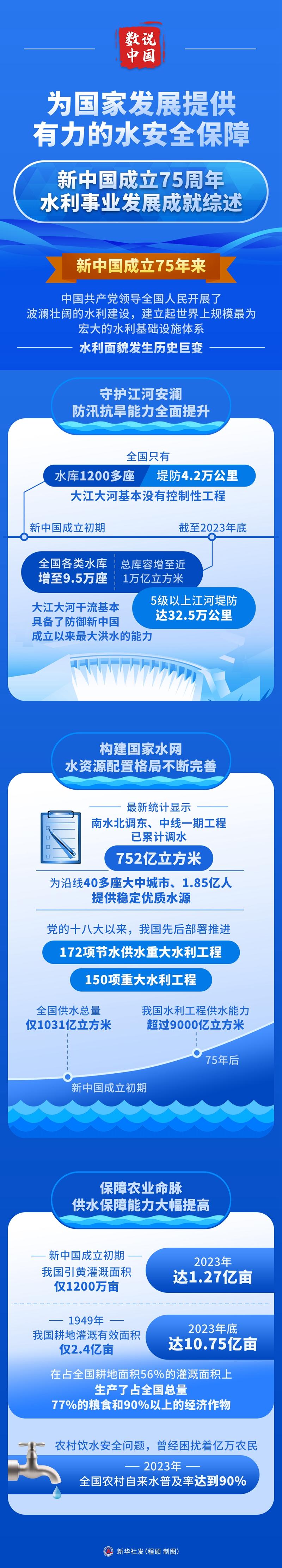 水利是农业的命脉。1949年,我国耕地灌溉有效面积仅2.4亿亩,2023年底达10.75亿亩。在占全国耕地面积56%的灌溉面积上,生产了占全国总量77%的粮食和90%以上的经济作物。