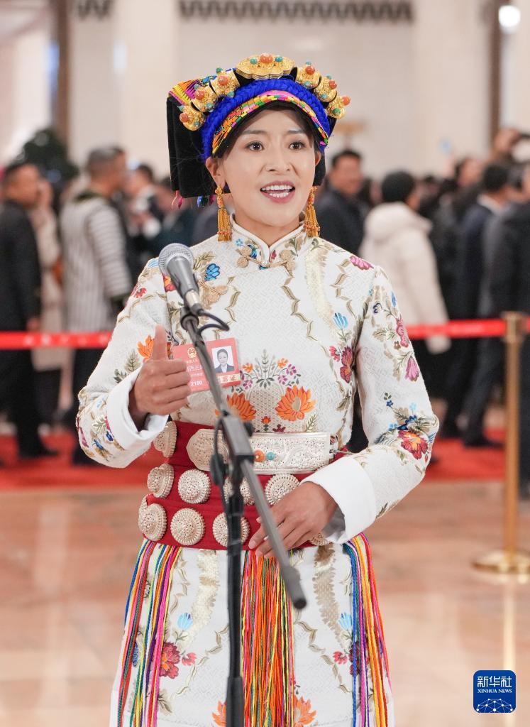 3月5日,第十四届全国人民代表大会第三次会议首场“代表通道”集中采访活动在北京人民大会堂举行。这是全国人大代表格西王姆接受媒体采访。