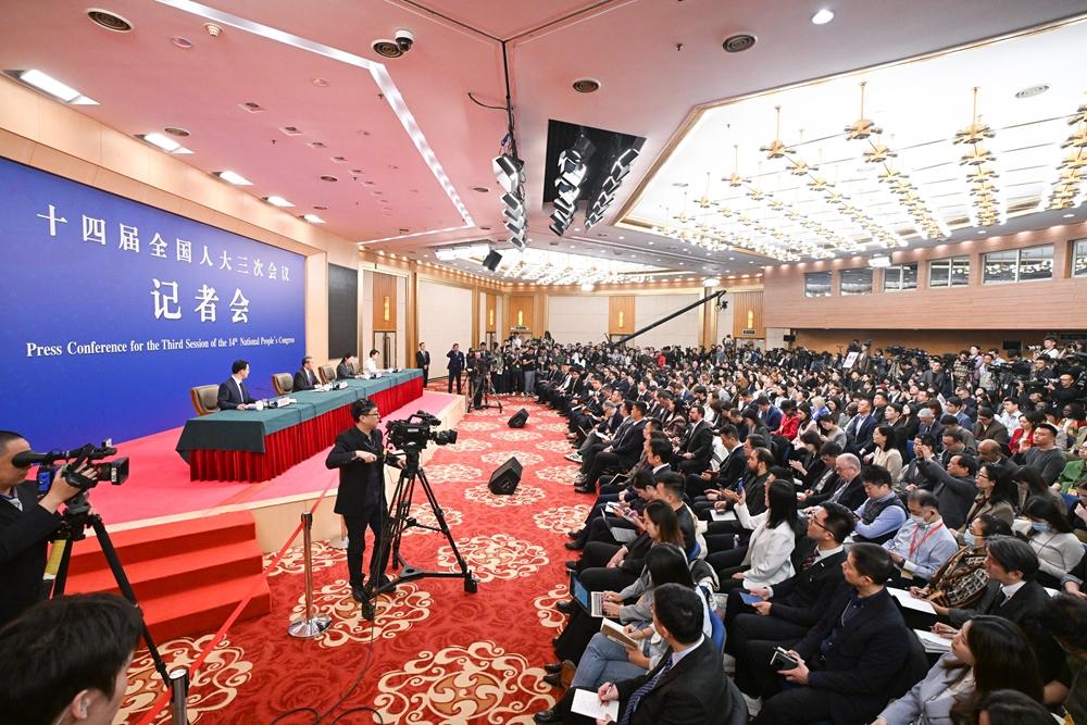3月7日,十四届全国人大三次会议在北京梅地亚中心新闻发布厅举行记者会。中共中央政治局委员、外交部长王毅就中国外交政策和对外关系回答中外记者提问。这是记者在现场采访。 新华社记者 陈晔华 摄