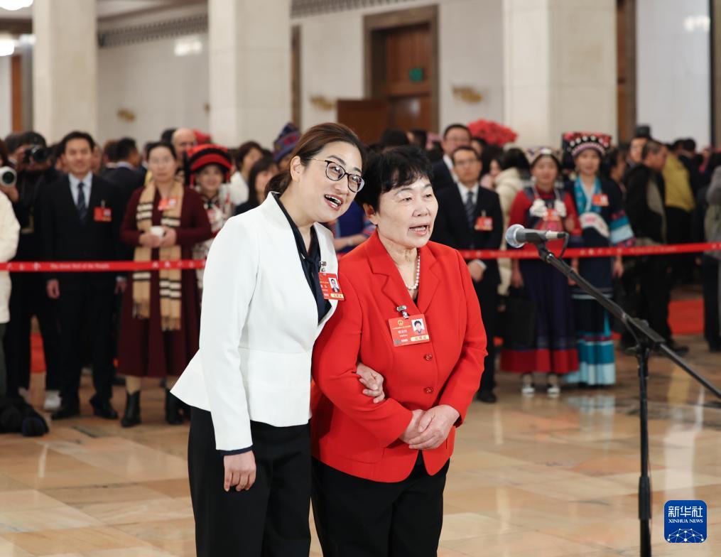 3月8日,第十四届全国人民代表大会第三次会议第二场“代表通道”集中采访活动在北京人民大会堂举行。这是全国人大代表盛弘(左)和杨宝玲向广大妇女致以节日祝福。