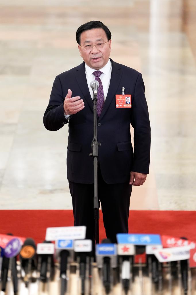 3月8日,第十四届全国人民代表大会第三次会议第二场“部长通道”集中采访活动在北京人民大会堂举行。这是水利部部长李国英接受媒体采访。