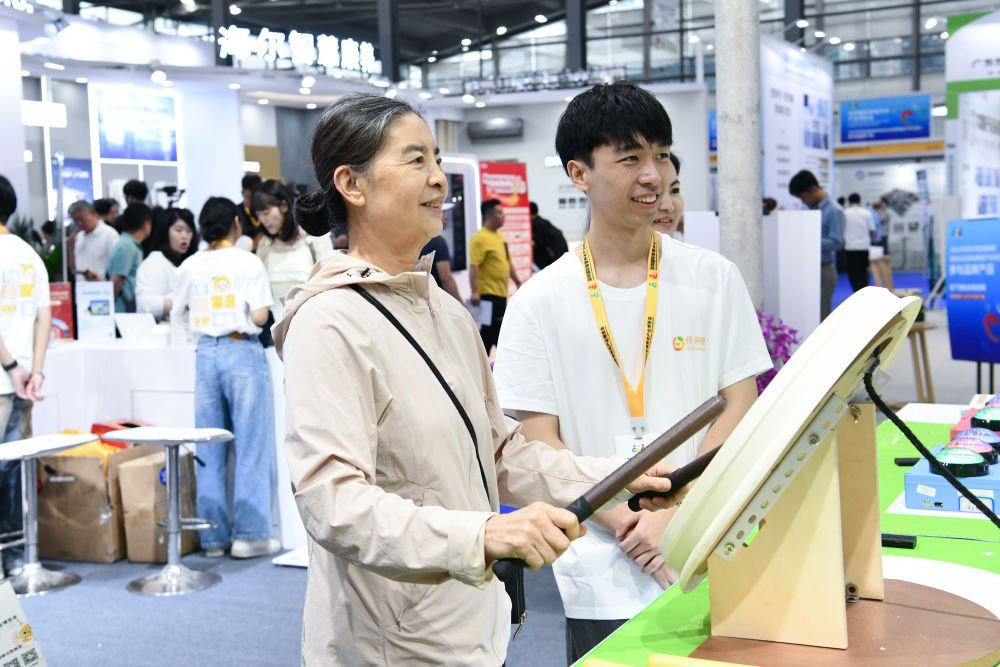 2024年10月27日,老人在2024深圳国际智慧养老产业博览会上体验乐龄鼓。新华社记者 梁旭 摄
