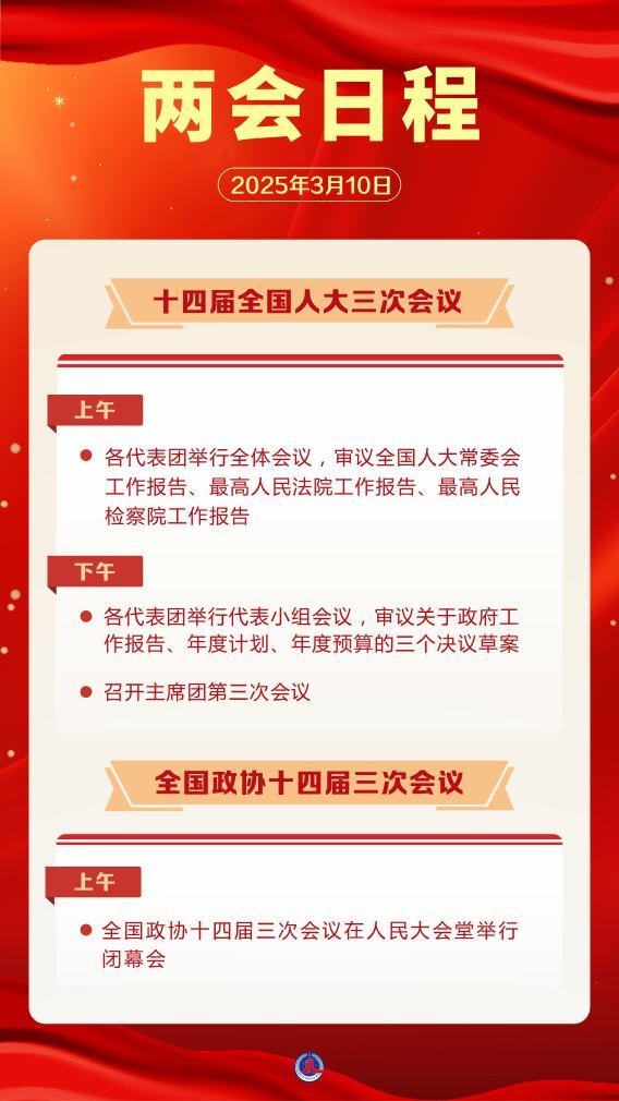 新华社北京3月9日电 十四届全国人大三次会议各代表团10日上午举行全体会议,审议全国人大常委会工作报告、最高人民法院工作报告、最高人民检察院工作报告。下午,各代表团举行代表小组会议,审议关于政府工作报告、年度计划、年度预算的三个决议草案;召开主席团第三次会议。