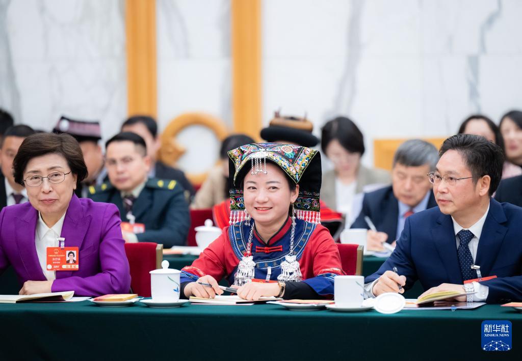3月5日,全国人大代表、贵州省安顺市镇宁布依族苗族自治县六马镇致富村党支部书记、村委会主任卢丹(中)在北京出席十四届全国人大三次会议贵州代表团全体会议。