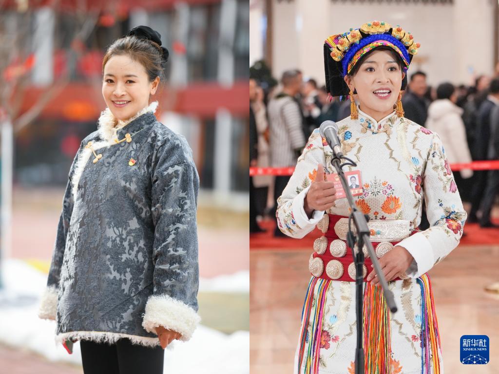 拼版照片:左图为在云南省南涧彝族自治县宝华镇拥政村拍摄的全国人大代表、南涧彝族自治县民族文化工作队队员鲁丽华(新华社记者陈欣波2025年2月7日摄);右图为在十四届全国人大三次会议云南代表团驻地拍摄的鲁丽华(新华社记者郑焕松2025年3月6日摄)。