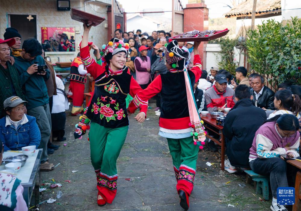 全国人大代表、云南省南涧彝族自治县民族文化工作队队员鲁丽华(前左)在南涧彝族自治县宝华镇拥政村表演跳菜(2025年2月7日摄)。