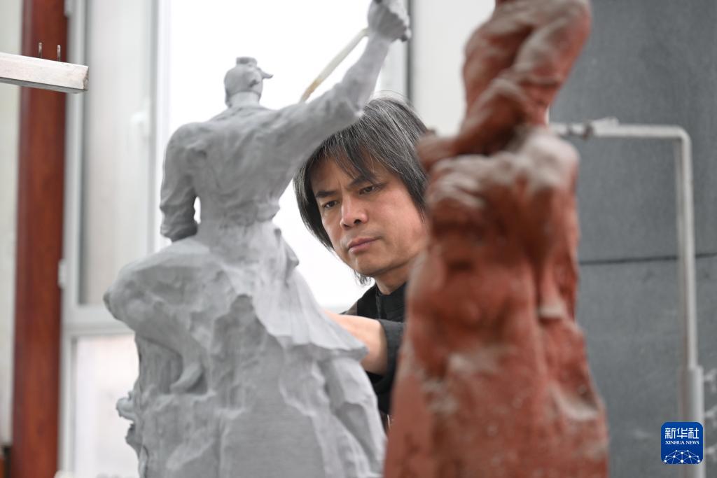 全国政协委员、河北翰鼎雕塑集团首席技师高英坡在河北省曲阳县的工作室进行雕塑创作(2025年2月21日摄)。