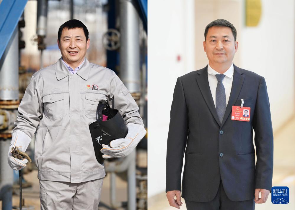 拼版照片:左图为在中石化第四建设有限公司工匠学院拍摄的全国人大代表、中石化第四建设有限公司工匠学院焊接教练张振连(新华社记者李然2025年1月21日摄);右图为在十四届全国人大三次会议天津代表团驻地拍摄的张振连(新华社记者邢广利2025年3月3日摄)。