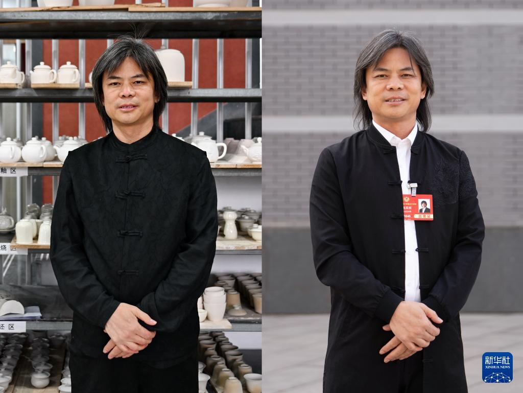 拼版照片:左图为在河北省曲阳县拍摄的全国政协委员、河北翰鼎雕塑集团首席技师高英坡(新华社记者牟宇2025年2月21日摄);右图为在北京的驻地拍摄的高英坡(新华社记者周荻潇2025年3月6日摄)。