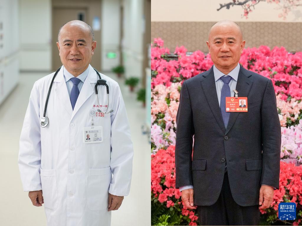 拼版照片:左图为在苏州大学附属第一医院拍摄的全国政协委员、苏州大学附属第一医院血液科主任吴德沛(新华社记者季春鹏2025年2月17日摄);右图为在北京人民大会堂拍摄的吴德沛(新华社记者周荻潇2025年3月4日摄)。