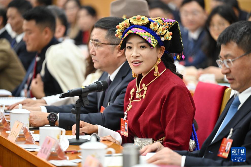 3月7日,全国人大代表、四川省阿坝藏族羌族自治州马尔康市老年养护院院长格西王姆在十四届全国人大三次会议四川代表团全体会议上发言。