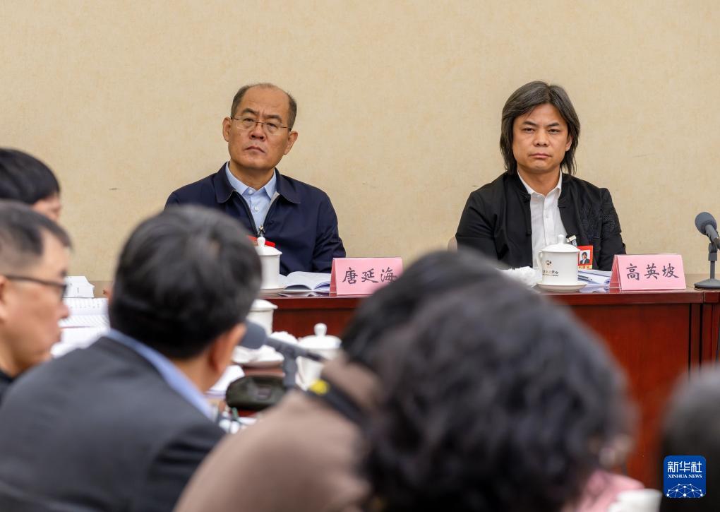 3月6日,全国政协委员、河北翰鼎雕塑集团首席技师高英坡(右一)在北京的驻地参加文化艺术界小组讨论。