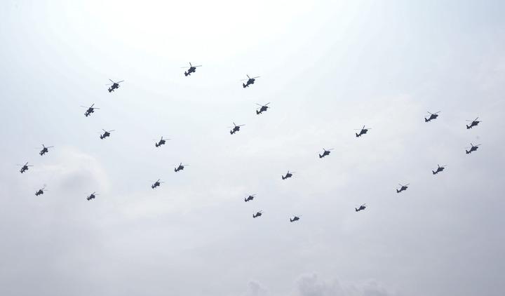 9月3日,纪念中国人民抗日战争暨世界反法西斯战争胜利80周年大会在北京隆重举行。这是空中护旗梯队通过天安门广场,26架直-19武装直升机组成“80”字样。新华社记者 陈晔华 摄